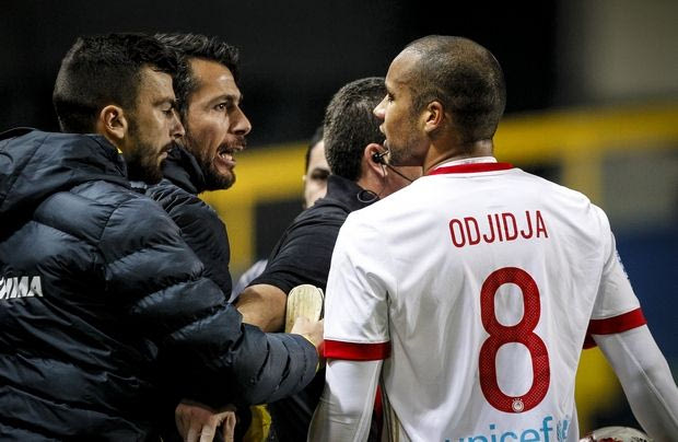 Ένα πλάγιο κοντά στον πάγκο του Παναιτωλικού και ένας... διάλογος του Οφόε με παίκτες των "καναρινιών", είχε ως αποτέλεσμα να φτύσει(;) ο Βέλγος προς το μέρος τους και να δημιουργηθεί ένας μικρός πανικός (φωτογραφίες)!