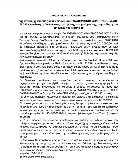 Η διαδικασία διήρκεσε ελάχιστα, αφού ήταν τυπική από τη στιγμή που ο Γιάννης Αλαφούζος αποφάσισε την αύξηση με την ιδιότητα του προέδρου της ΠΑΕ και αναμένεται να την καλύψει ο ίδιος, ως μεγαλομέτοχος.