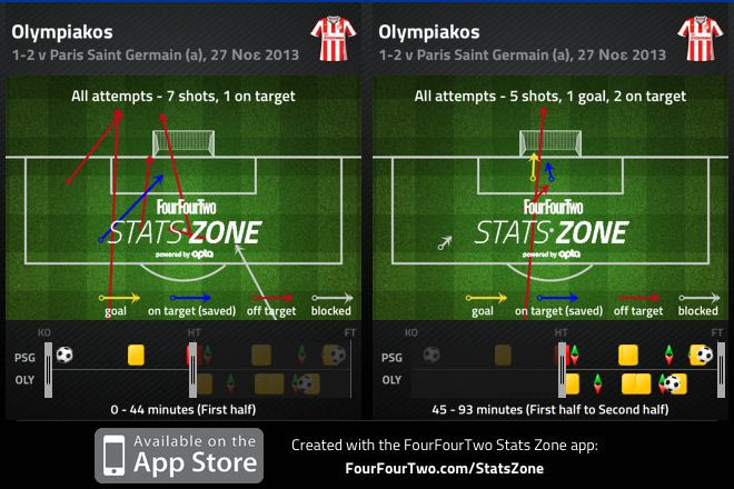 Καθόλου τυχαία, όσο κι αν προσπάθησαν Βάις, Τσόρι και Σαβιόλα, όσο και αν προσπαθούσε για ρήγματα ο Χολέμπας, ο Ολυμπιακός φάσεις δεν βρήκε. Στο γράφημα βλέπετε τα σουτ του πρώτου ημιχρόνου, σε σχέση μ’ αυτά του δεύτερου. Στην επανάληψη, οι ερυθρόλευκοι βρήκαν τέρμα με προσπάθειες μέσα απ’ την περιοχή μόνο στη φάση του γκολ, εκεί που στάθηκαν για δεύτερη φορά τυχεροί, στο μη καταλογισμό του οφσάιντ στον Τσόρι.