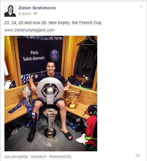 Ο Σουηδός σταρ μάλιστα καμαρώνει γι’ αυτήν στο facebook έχοντας φωτογραφίες με τα τέσσερα τρόπαια που κατέκτησε μέσα στη σεζόν με την Παρί Σεν Ζερμέν.