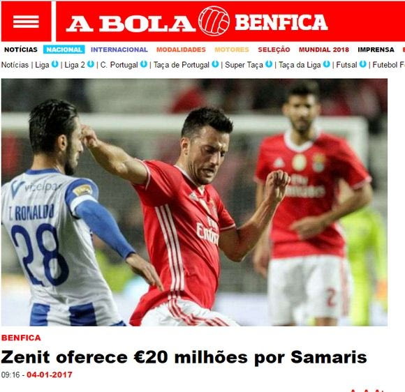 Σύμφωνα με δημοσίευμα της πορτογαλικής “A Bola”, η Ζενίτ κατέθεσε επίσημη πρόταση ύψους 20.000.000 ευρώ στην Μπενφίκα για τον Ανδρέα Σάμαρη η οποία αναμένεται να γίνει αποδεκτή.