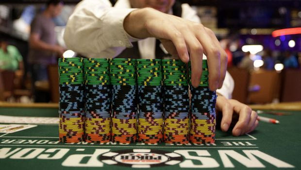 FILE - In this July 5, 2014, file photo, dealer Omar Abu-Eid adjusts a stack of chips before the first day of the World Series of Poker main event in Las Vegas. When nine players take their seats around a studio-lit poker table at the Rio All-Suite Hotel & Casino in Las Vegas starting Monday, Nov. 10, 2014, to vie for a $10 million top prize playing Texas Hold 'em, they will be among the tournament's youngest and greenest in recent history, with none having won a title before. (AP Photo/John Locher, File) AP Photo/John Locher