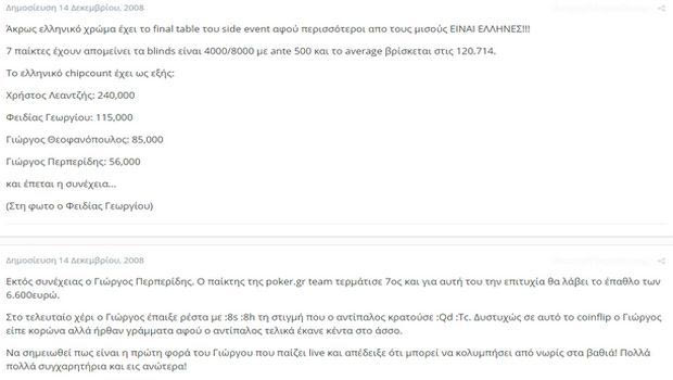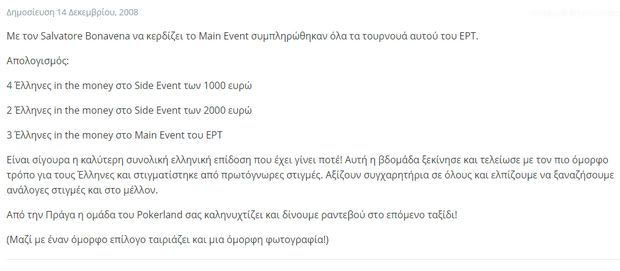 Στο European Poker 5 της Πράγας ήταν οι Έλληνες παίκτες που έκαναν θραύση, καθώς συνολικά εννέα μπήκαν στα χρηματικά έπαθλα. Τρεις στο main event, άλλοι δύο στο side event των 200ο ευρώ και τέσσερις στο side event των 1000 ευρώ. Η καλύτερη ελληνική επίδοση που είχε γίνει ποτέ, μέχρι τότε. Η νύχτα που η Πράγα υποκλίθηκε στους Έλληνες.