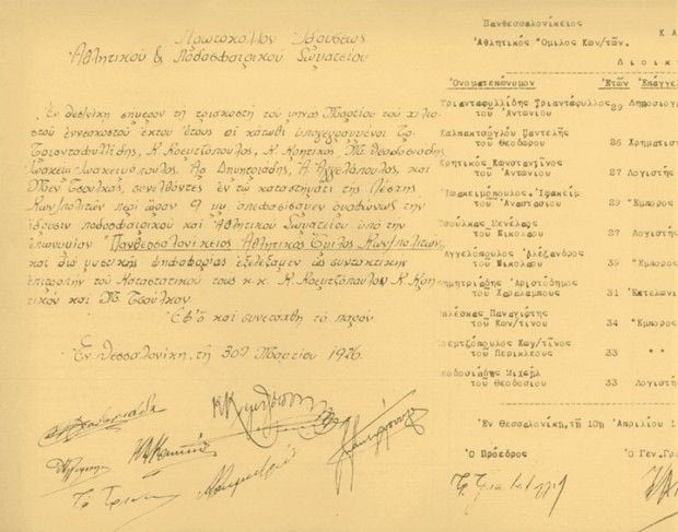 Εν Θεσ/νίκη σήμερον τη τριακοστή τού μηνός Μαρτίου τού χιλιοστού εννεακοστού (εικοστού) έκτου έτους οι κάτωθι υπογεγραμμένοι Τρ.Τριανταφυλλίδης, Κ.Κοεμτζόπουλος, Κ.Κρητικός, Μ.Θεοδοσιάδης, Ιωακείμ Ιωακειμόπουλος, Αρ.Δημητριάδης, Α.Αγγελόπουλος και Μεν.Τσούλκας συνελθόντες εν τω καταστήματι τής Λέσχης Κων/πολιτών περί ώραν 9μμ απεφασίσαμεν ομοφώνως την ίδρυσιν ποδοσφαιρικού και Αθλητικού Σωματείου υπό την επωνυμίαν “Πανθεσσαλονίκειος Αθλητικός Όμιλος Κων/πολιτών” και δια μυστικής ψηφοφορίας εξελέξαμεν ως συντακτικήν επιτροπήν τού Καταστατικού τούς κ.κ. Κ.Κοεμτζόπουλο, Κ.Κρητικόν και Μ.Τσούλκαν.