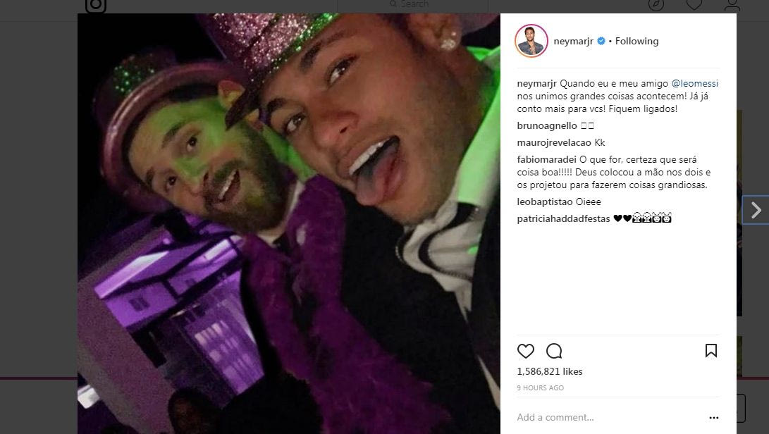 Τι δουλειά έχουν μαζί Λιονέλ Μέσι και Νεϊμάρ Τζούνιορ; Ο Βραζιλιάνος ανέβασε φωτογραφία στο Instagram που είναι... αγκαλιά με τον Αργεντινό και έβαλε... φωτιά στο ίντερνετ. "Σπουδαία πράγματα θα συμβούν", έγραψε και μας έβαλε σε σκέψεις.
