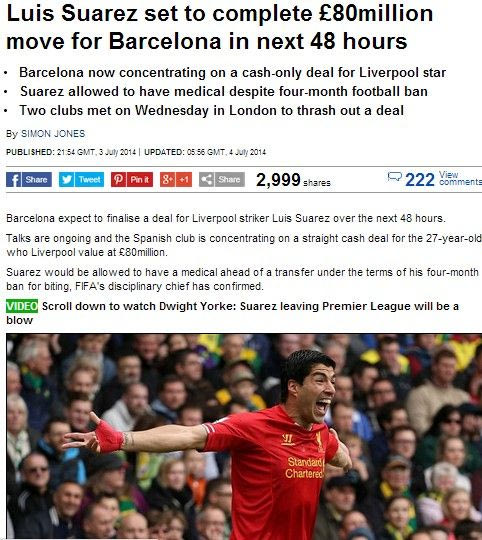 Μερικές εβδομάδες αργότερα, o Σουάρες τα έχει βρει σε όλα με την Μπαρτσελόνα, η Λίβερπουλ έχει αποφασίσει να τον πουλήσει και το μόνο που μένει είναι το αν ο Αλέξις Σάντσες θα είναι μέρος του deal. Επιλέγει την Άρσεναλ και την επόμενη μέρα η Μπάρτσα ανακοινώνει τον Σουάρες και συμφωνεί να πληρώσει σε μετρητά το ποσό που θέλει η Λίβερπουλ.