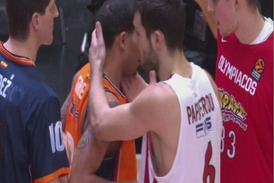 Λίγα δευτερόλεπτα μετά το σφύριγμα της λήξης στη νίκη του Ολυμπιακού επί της Βαλένθια με 72-64, ο τηλεοπτικός φακός έπιασε τον Ιωάννη Παπαπέτρου να... παρηγορεί τον Έρικ Γκριν που άλλαξε στρατόπεδο το καλοκαίρι (φωτογραφία).