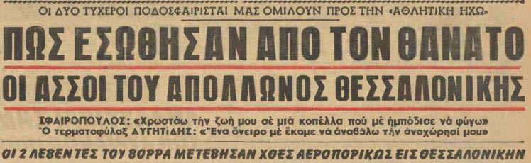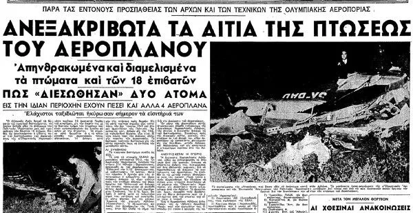 Ο Σάββας Σφαιρόπουλος ματαίωσε το ταξίδι για προσωπικούς λόγους ενώ ο Αυγητίδης ακολουθώντας λόγω κακού προαισθήματος έμεινε επίσης εκτός. Είκοσι λεπτά μετά την αναχώρηση της πτήσης και μετά από έκρηξη στη δεξαμενή, το αεροπλάνο κατέπεσε στον Αυλώνα Αττικής και οι 18 επιβαίνοντες σκοτώθηκαν!