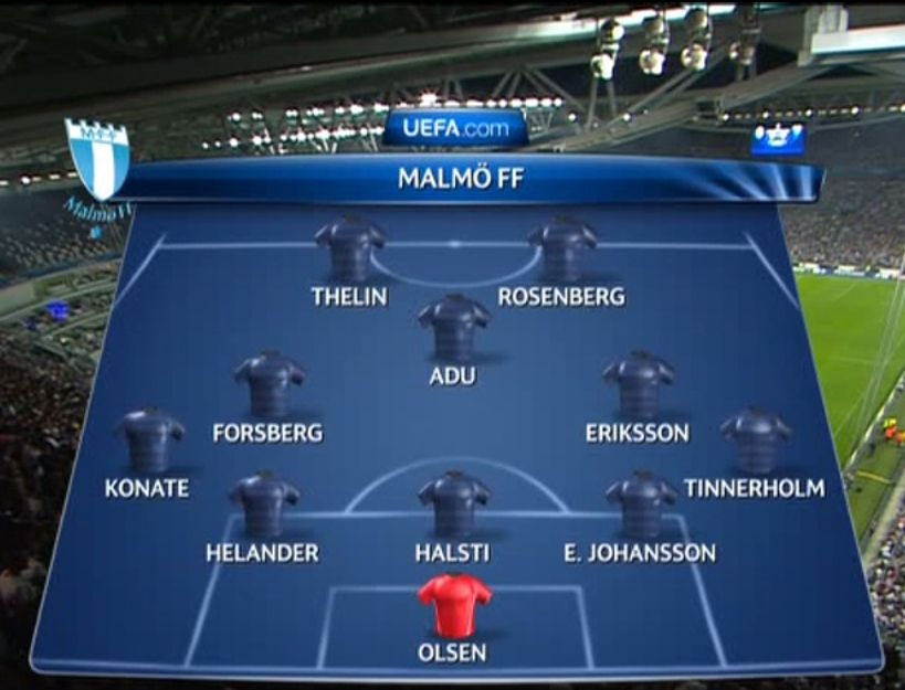 Η λογική και το ρεπορτάζ λένε πως η Μάλμε θα είναι διαφορετική κόντρα στον Ολυμπιακό. Ο Χάλστι θα ανέβει στο κέντρο στο πλευρό του Αντού και η διάταξη θα γίνει 4-42. Ο Φόρσμπεργκ θα παίξει αριστερά, δεξιά μάλλον θα παίξει ο Κρουν που μπήκε ως αλλαγή στο Τορίνο και στην επίθεση θα πάνε ο Ρόσενμπεργκ με τον Έρικσον.
