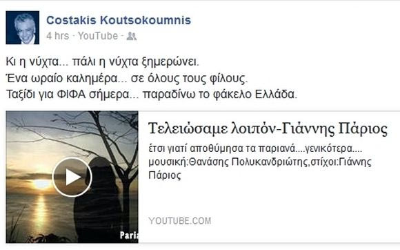 “Κι η νύχτα… πάλι η νύχτα ξημερώνει. Ένα ωραίο καλημέρα… σε όλους τους φίλους. Ταξίδι για ΦΙΦΑ σήμερα… παραδίνω το φάκελο Ελλάδα”, ανέφερε χαρακτηριστικά ο Κύπριος παράγοντας, ο οποίος συνοδεύει την είδηση με ένα τραγούδι του Γιάννη Πάριου.