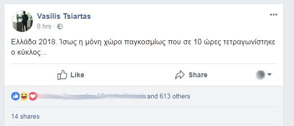 “Ελλάδα 2018. Ίσως η μόνη χώρα παγκοσμίως που σε 10 ώρες τετραγωνίστηκε ο κύκλος…”, ήταν το μήνυμα του και στα σχόλια έγινε ένας μικρός χαμός.