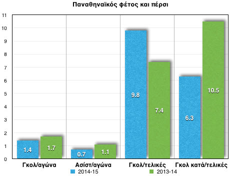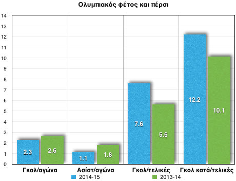 Ο Ολυμπιακός είναι αλήθεια πως δεν θα μπορούσε με ευκολία να επαναλάβει τα νούμερα της περσινής σεζόν, όταν και έκανε περίπατο στο πρωτάθλημα. Το πρόγραμμα δεν ήταν και πολύ εύκολο μέχρι τώρα και έτσι οι ερυθρόλευκοι παρουσιάζονται λίγο ή πολύ χειρότεροι σε όλες τις επιθετικές κατηγορίες. Σημαντικότερη πτώση είναι αυτή στις ασίστ ανά αγώνα, που αντικατοπτρίζεται και στις δύο περισσότερες τελικές προσπάθειες που απαιτούνται για να βρει δίχτυα ο φετινός Ολυμπιακός, παρά το γεγονός πως στα δύο τελευταία ματς έκανε περίπατο κόντρα σε Πανθρακικό και Κέρκυρα, με τέρματα 9-1.