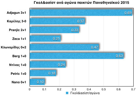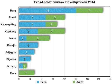 Πέρσι ο Μπεργκ ήταν μια κλάση μπροστά απ’τους υπόλοιπους. Ο Σουηδός είχε άμεση συμμετοχή σε 22 γκολ του Παναθηναϊκού, με τους Καρέλη και Αμπέντ να ακολουθούν. Αξιοσημείωτο το γεγονός πως πρώτοι σε ασίστ ήταν οι δύο φορ, ο Μπεργκ με τον Καρέλη, που στην ουσία εκμεταλλεύτηκαν ο ένας την παρουσία του άλλου, με τρόπο παρόμοιο με την περσινή συνεργασία Σουάρες-Στάριτζ στη Λίβερπουλ, χωρίς να βασίζονται πολύ σε μεσοεπιθετική ποιότητα.