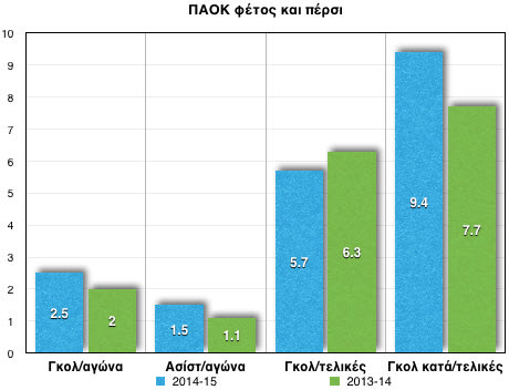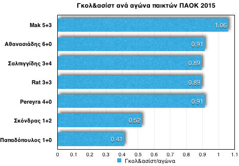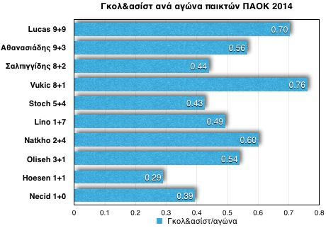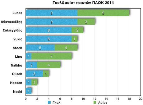 Ο ΠΑΟΚ πέρσι είχε πιο γεμάτο ρόστερ, αλλά στην ουσία λίγοι παίκτες προσέφεραν με διάρκεια στον τομέα των γκολ/ασίστ. Ο Λούκας ήταν ο μόνος σταθερός σ’όλη τη διάρκεια της σεζόν, αφού ο Κλάους “ξύπνησε” στο δεύτερο γύρο, ενώ το πρόβλημα στη δημιουργία φανερώνεται και στο γεγονός πως 2ος στις ασίστ ήταν ο Λίνο.