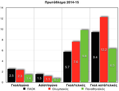 Όπως φαίνεται και στο γράφημα, ο ΠΑΟΚ δεν προπορεύεται μόνο στη βαθμολογία, αλλά και σχεδόν σ’όλες τις βασικές κατηγορίες. Η ομάδα του Άγγελου Αναστασιάδη έχει περισσότερα γκολ και ασίστ ανά αγώνα, ενώ χρειάζεται τις λιγότερες τελικές προσπάθειες (5.7) για να πετύχει γκολ. Στην άμυνα μόνο υπολείπεται του Ολυμπιακού, με τον εκάστοτε αντίπαλο του ΠΑΟΚ να χρειάζεται 9.4 τελικές για να σκοράρει.