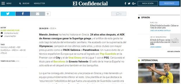Μετά τη μεγάλη του συνέντευξη στην “AS”, δηλώσεις του Μανόλο Χιμένεθ φιλοξενήθηκαν και στην “El Confidencial”. Ο τεχνικός της ΑΕΚ, που μένει ελεύθερος το καλοκαίρι, είναι αρκετά επικοινωνιακός ειδικότερα όσον αφορά τα ΜΜΕ της πατρίδας του, προσέχοντας πάντα τι και πως το λέει.