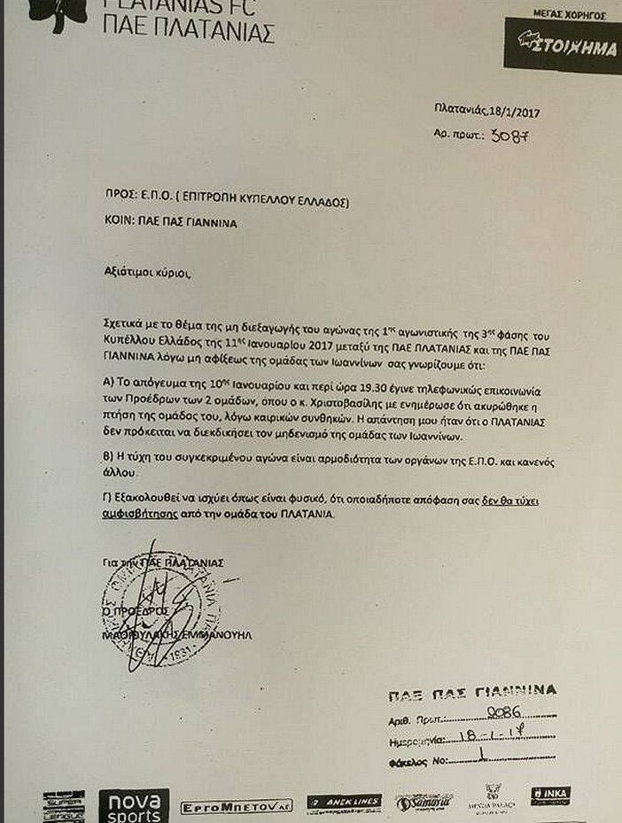 Προσκόμισε μάλιστα, επιστολή με υπογραφή του προέδρου του Πλατανιά Μανώλη Μαθιουλάκη προς την Επιτροπή Κυπέλλου σύμφωνα με την οποία μόλις ενημερώθηκε ότι ο ΠΑΣ δεν μπορεί να ταξιδέψει για τα Χανιά… “η απάντηση μου ήταν ότι ο Πλατανιάς δεν πρόκειται να διεκδικήσει τον μηδενισμό της ομάδας των Ιωαννίνων. Η τύχη του συγκεκριμένου αγώνα είναι αρμοδιότητα των οργάνων της ΕΠΟ και κανενός άλλου. Οποιαδήποτε απόφαση δεν θα τύχει αμφισβήτησης από την ομάδα του Πλατανιά”.
