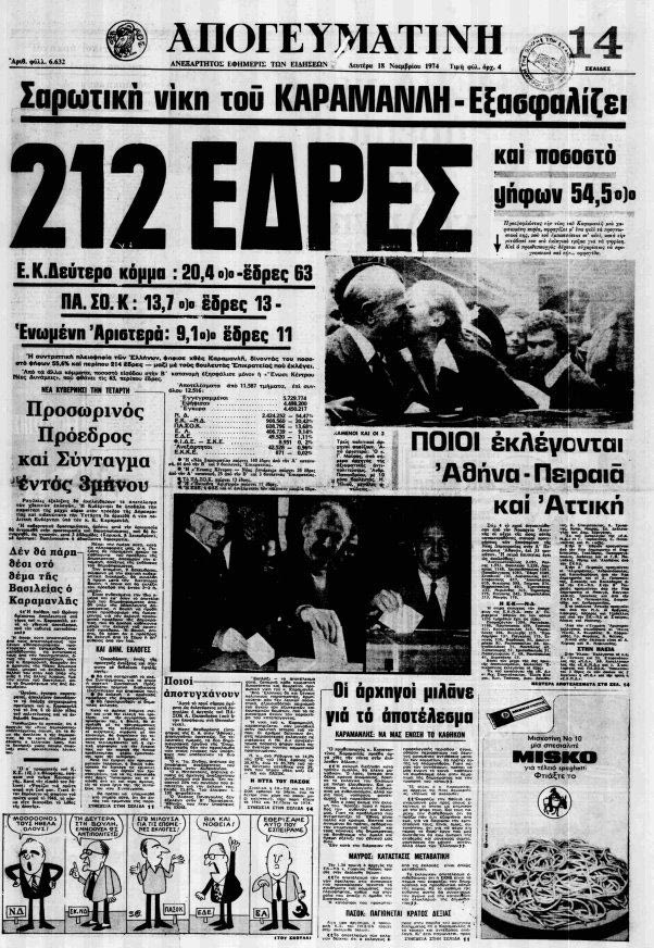 Την Κυριακή πάντως, όλοι πήγαν στις κάλπες. Οι πρώτες ελεύθερες εκλογές (7 χρόνια οι Έλληνες είχαν ψηφίσει μόνο στα κωμικά δημοψηφίσματα της Χούντας) έχουν ποσοστό συμμετοχής σχεδόν 80%. Η Νέα Δημοκρατία, το κόμμα που ίδρυσε ο Καραμανλής, κερδίζει την πλειοψηφία με 54,37% και 220 έδρες στη Βουλή, η ΕΚΝΔ (Ένωσις Κέντρου- Νέες Δυνάμεις) του Γεωργίου Μαύρου είναι η αξιωματική αντιπολίτευση με 20,42%, ενώ κοινοβουλευτική εκπροσώπηση αποκτούν το νεοσύστατο ΠΑΣΟΚ του Ανδρέα Παπανδρέου (13,58%) και η Ενωμένη Αριστερά στην οποία μετέχουν το ΚΚΕ, το ΚΚΕ εσωτερικού και η ΕΔΑ (9,47%) Πρώτο μέλημα της νέας κυβέρνησης, να οδηγήσει τη χώρα στο δημοψήφισμα για το πολίτευμα. Έναν μήνα μετά, η λαϊκή ετυμηγορία καταργούσε οριστικά τη Βασιλεία στην Ελλάδα και με το Σύνταγμα του 1975 μπαίναμε οριστικά στην Γ’ Ελληνική Δημοκρατία.