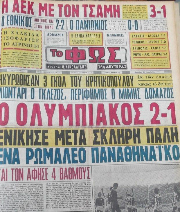Το “ΦΩΣ της Δευτέρας” σημειώνει ότι ακυρώθηκαν και 3 γκολ του αείμνηστου Κρητικόπουλου, εκ των οποίων το 2ο κακώς και τονίζει ότι η διαφορά των δυο ομάδων είχε πάει στους 4 βαθμούς. Τελικά, έφτασε στο +17, αλλά δεν ήταν ο Παναθηναϊκός τότε ο μεγάλος αντίπαλος των Πειραιωτών. Ο Ολυμπιακός στέφθηκε πρωταθλητής (ο τελευταίος τίτλος της μεγάλης ομάδας του Γουλανδρή) με διαφορά 2 βαθμούς από τη σπουδαία ΑΕΚ.