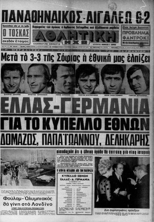 Αφορμή για όλα αυτά έδωσε (ποιος άλλος;) ο δαιμόνιος Γιώργος Νικητόπουλος, συνεργάτης της στήλης που λέγαμε και παλιά, χωρίςνα το ξέρει! Τα ποσταρίσματά του στο Facebook δίνουν πάντοτε ερέθισμα για αναζήτηση μεγάλων στιγμών του παρελθόντος. Ο μανιώδης συλλέκτης ανακάλυψε ότι πρόσφατα στο YouTube ανέβηκε ολόκληρος ο μεγάλος αγώνας της 20ής Νοεμβρίου 1974, μεταξύ Ελλάδας και Δυτικής Γερμανίας, από την τότε μετάδοση της ZDF (με εικόνα από το ΕΙΡΤ, όπως ονομαζόταν ακόμα η ΕΡΤ).