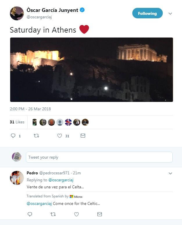 Την ώρα που πλήθος δημοσιευμάτων από την Ισπανία θέλουν τον Όσκαρ Γκαρθία να είναι περιζήτητος στην Πριμέρα, ο τεχνικός του Ολυμπιακού ανέβασε tweet με φόντο την Ακρόπολη και μία... καρδούλα. Το... φλερτ οπαδού της Θέλτα (φωτογραφία)!