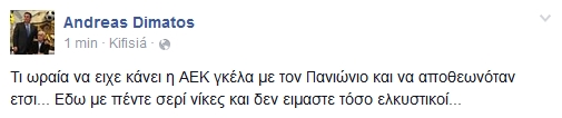Με ανάρτησή του στον προσωπικό του λογαριασμό στο facebook, ο κ.Δημάτος εξέφρασε την απορία του για την θετική αντιμετώπιση του αγώνα του Παναθηναϊκού με τον Πανιώνιο, παρά την απώλεια δύο βαθμών, φέρνοντας ως παράδειγμα την αντιμετώπιση που έχει η ΑΕΚ από φίλους και δημοσιογράφους.