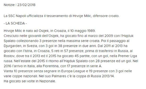 Δια στόματος Αουρέλιο ντε Λαουρέντις επισημοποιήθηκε η ένταξη του Χρβόγιε Μίλιτς στη Νάπολι. Το... λάθος των παρτενοπέι στο βιογραφικό του.