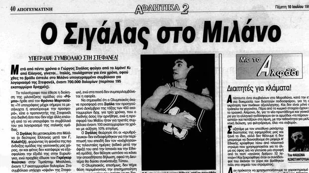 Στη διάρκεια της σεζόν 1996-97, Ολυμπιακός και Σιγάλας δεν είχαν καταλήξει σε συμφωνία για την ανανέωση του συμβολαίου του και το καλοκαίρι, επικυρώθηκε ό,τι τον χειμώνα είχε διαφανεί. Οι δρόμοι χώριζαν οριστικά, με τον διεθνή άσο (στα ντουζένια του τότε, καθώς ήταν 26 ετών) να μετακομίζει στην Ολίμπια Μιλάνου και να αποχαιρετά τον Ολυμπιακό με μια ανοιχτή επιστολή, στην οποία μεταξύ άλλων υπογράμμιζε: “Έχω ήσυχη τη συνείδησή μου, ξέρω τι έκανα για να μείνω, όπως επίσης οι άνθρωποι του Ολυμπιακού γνωρίζουν πολύ καλά τι (δεν) έκαναν για να με κρατήσουν“.