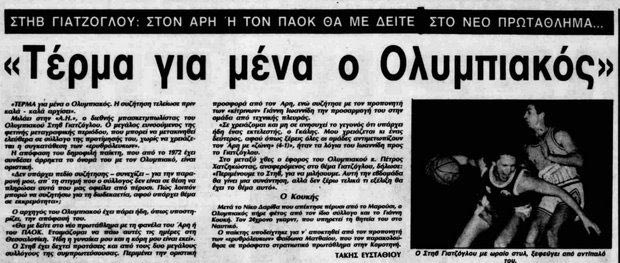 Ο Στιβ Γιατζόγλου είχε καταφτάσει στον Ολυμπιακό το 1972, σε ηλικία 23 ετών. Η θητεία του στον Πειραιά ήταν αρκετά περιπετειώδης, καθώς το 1978 ύστερα από προσωπικά προβλήματα που του κόστισαν μια ποινή φυλάκισης 14 μηνών (με αναστολή) και ένα ταξίδι στο Ισραήλ, όπου βρέθηκε στο Τελ Αβίβ, σχεδόν σίγουρος ότι θα παίξει στη Χάποελ. Ο Ολυμπιακός δεν είχε συναινέσει, ο Γιατζόγλου επέστρεψε στην Ελλάδα και επανεντάχθηκε στους Πειραιώτες, παίζοντας μέχρι το 1984.
