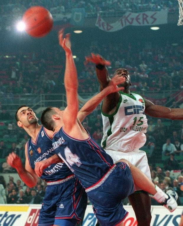 US Ronnie Smith of Asvel Lyon Villeurbanne, at right, stretches for a ball as FC Barcelona's Arturas Karnisovas, center, and Ramon Rivas tackle him, Tuesday, April 22, 1997, during their European basketball Final Four in Rome. (AP Photo/Plinio Lepri) Associated Press