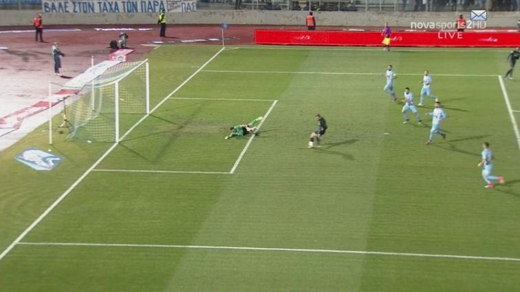 Με τον Βελλίδη εξουδετερωμένο, ο Έλληνας άσος το μόνο που είχε να κάνει ήταν να την σπρώξει στα δίχτυα. Αντί για αυτό όμως, έκανε ένα περίεργο σουτ, με τη μπάλα να φεύγει άουτ σε κενή εστία.