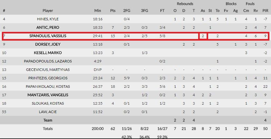 Ιδού και το συνολικό στατιστικό του Ολυμπιακού με τον Σπανούλη να εμφανίζεται να έχει δύο ασίστ σε όλο τον τελικό.