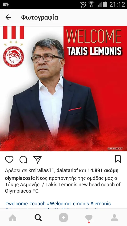 Ο Κέβιν Μιραλάς φαίνεται πως... στηρίζει την επιλογή του Τάκη Λεμονή στον πάγκο του Ολυμπιακού, αφού έδωσε το "like" του στο ποστάρισμα των ερυθρολεύκων (φωτογραφία).