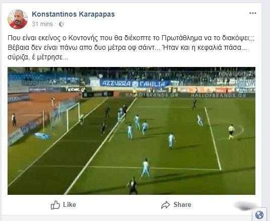 “Που είναι εκείνος ο Κοντονής που θα διέκοπτε το Πρωτάθλημα να το διακόψει;;; Βέβαια δεν είναι πάνω από δυο μέτρα οφ σάιντ… Ήταν και η κεφαλιά πάσα… σύριζα, έ μέτρησε…”