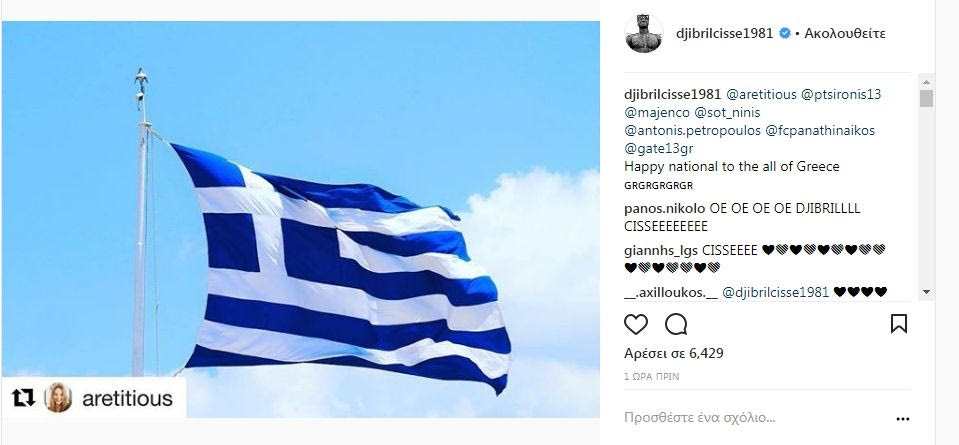 ” Καλή Εθνική επέτειο σε όλη την Ελλάδα“, έγραψε ο Τζιμπρίλ και συνόδευσε το ποστάρισμα του με μία ελληνική σημαία, ενώ τάγκαρε τους Αντώνη Πετρόπουλο και Σωτήρη Νίνη, με τους οποίους υπήρξε συμπαίκτης στον Παναθηναϊκό.