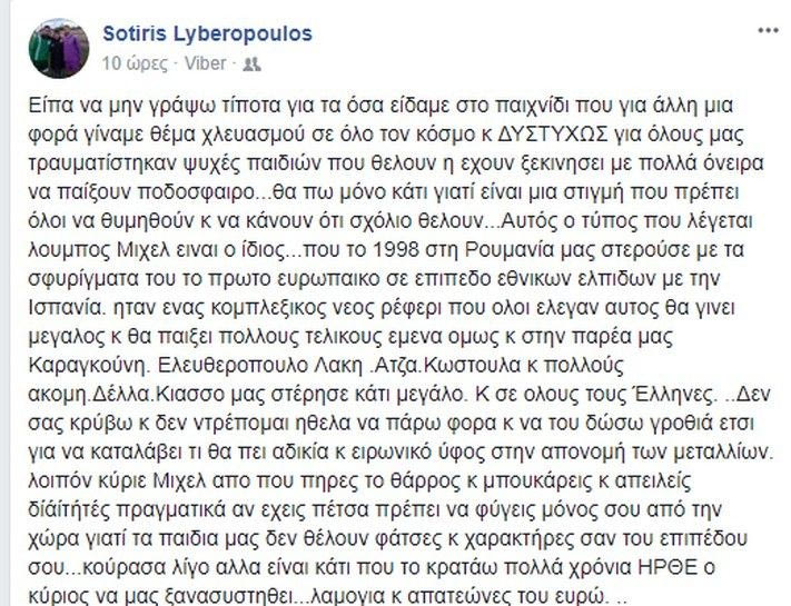 Ο Λούμπος Μίχελ είχε σφυρίξει το τελικό του ευρωπαϊκού πρωταθλήματος ελπίδων του 1998 και είχε αδικήσει την Εθνική. Αυτό θυμήθηκε ο Σωτήρης Λυμπερόπουλος και...ξεσπάθωσε στο facebook.