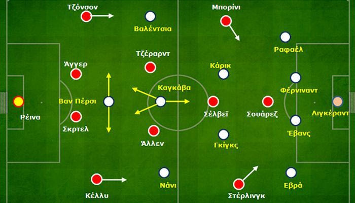 -Ο Καγκάβα έπαιξε τον ρόλο του «πασπαρτού» σε όλο το μήκος του άξονα καλύπτοντας μέτρα του Γκιγκς ενώ βοήθησε , όταν χρειάστηκε , τον Βαν Πέρσι στην επίθεση.