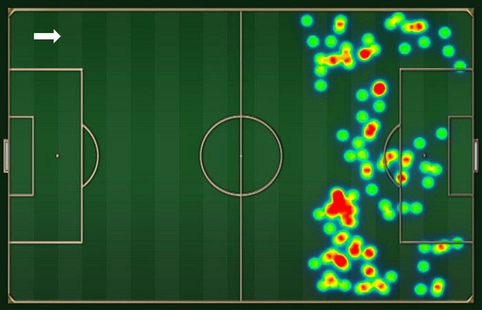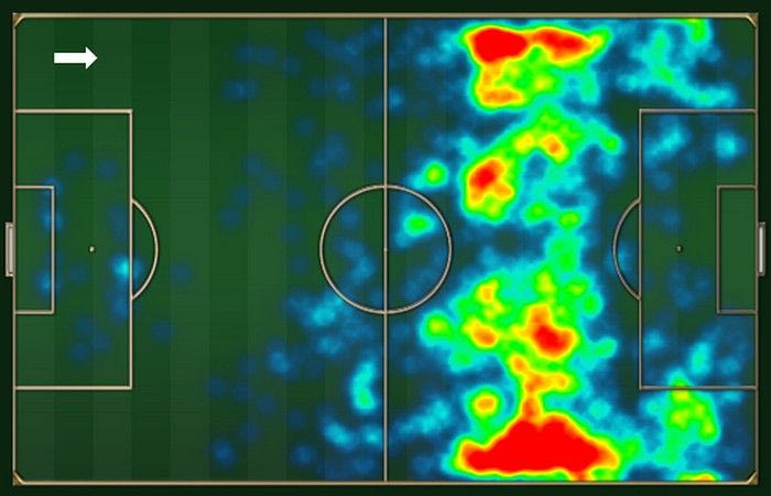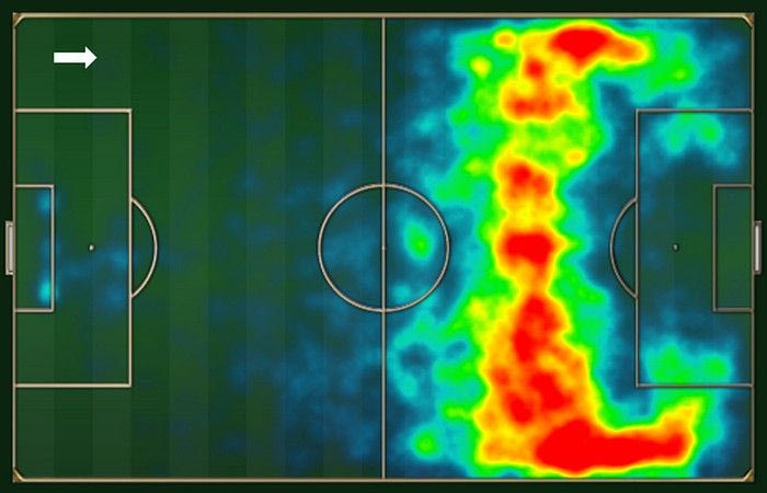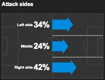 Στα γραφήματα με τις περιοχές που παίζει περισσότερο η Γιουνάιτεντ, το παιχνίδι απ’τα άκρα ήταν ίδιο σε σχέση με την περσινή χρονιά, αλλά ο άξονας ήταν εμφανώς “αδυνατισμένος” στο δεύτερο, φετινό γράφημα.