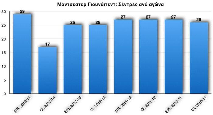 Όντως, η Γιουνάιτεντ φέτος σεντράρει περισσότερο. Στην Πρέμιερ Λιγκ τουλάχιστον, γιατί στο Champions League το νούμερο πέφτει κατά πολύ. Όπως βλέπουμε και στο γράφημα, οι 29 σέντρες ανά αγώνα μπορεί να είναι το μεγαλύτερο νούμερο των τελευταίων χρόνων, αλλά δεν είναι μεγάλη η διαφορά απ’τις τρεις τελευταίες σεζόν του Φέργκιουσον σε Αγγλία και Champions League (φάση ομίλων).
