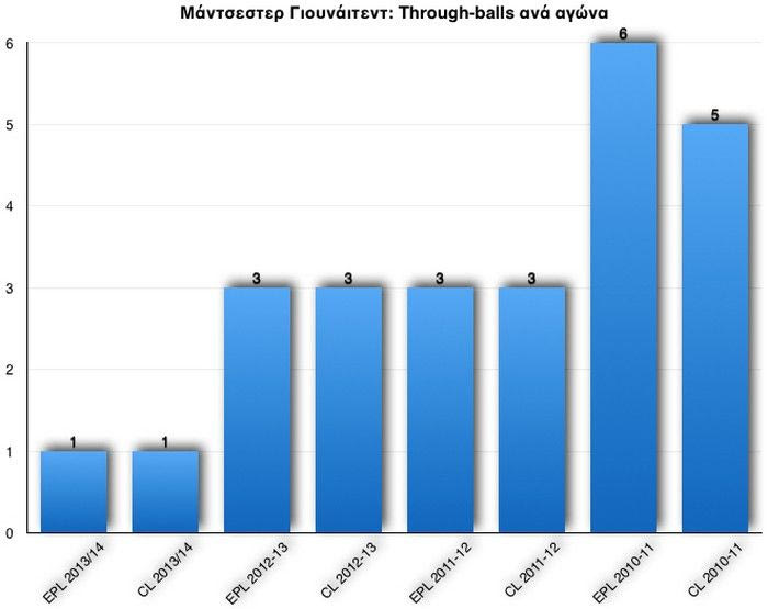 Κι εδώ η φετινή Γιουνάιτεντ αποτυγχάνει οικτρά και στην Πρέμιερ και στα έξι ματς των ομίλων: μόλις μία κάθετη ανά αγώνα περνάει η ομάδα του Μόγες. Τα τελευταία δύο χρόνια με τον Φέργκιουσον η Γιουνάιτεντ περνούσε τρεις ανά αγώνα και το 2011 είχε έξι στα εγχώρια παιχνίδια και πέντε στα ευρωπαϊκά. Καθόλου τυχαία η σταδιακή κάθοδος, αφού η Γιουνάιτεντ του 2011 ήταν πολύ καλύτερη απ’όσες ακολούθησαν και είχε φτάσει στον τελικό του Champions League.