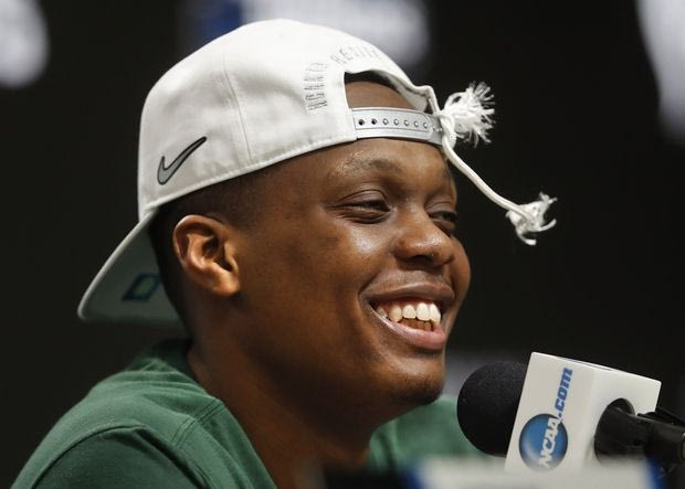 Michigan State guard Cassius Winston (5) smiles while answering questions during a news conference after beating Duke 68-67 of a NCAA men's East Regional final college basketball game in Washington, Sunday, March 31, 2019. (AP Photo/ Mark Tenally) AP