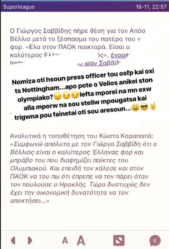Όλα αυτά τράβηξαν την προσοχή του διευθυντή επικοινωνίας της ΠΑΕ Ολυμπιακός, Κώστας Καραπαπά, ο οποίος έγραψε πως ο Βέλλιος είναι παίκτης των ερυθρόλευκων και πως δεν μπορεί να τον αγοράσει ο ΠΑΟΚ! Μια ωραία… ατμόσφαιρα δηλαδή.