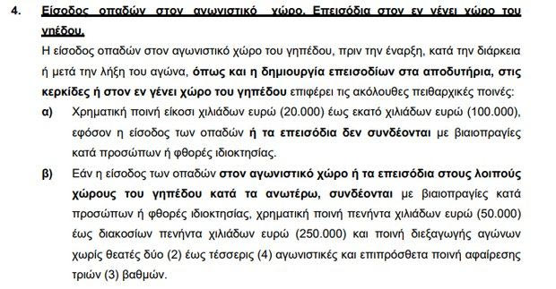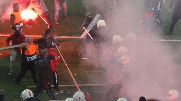 Οι οπαδοί των Πειραιωτών μπήκαν στον αγωνιστικό χώρο και σύμφωνα με το άρθρο 15 παρ. 4 απειλούνται με επιβολή προστίμου ως και ποινή αποκλεισμού της έδρας τους για 2 έως 4 αγωνιστικές – ανάλογα με την τελική ετυμηγορία – και αφαίρεση βαθμών.