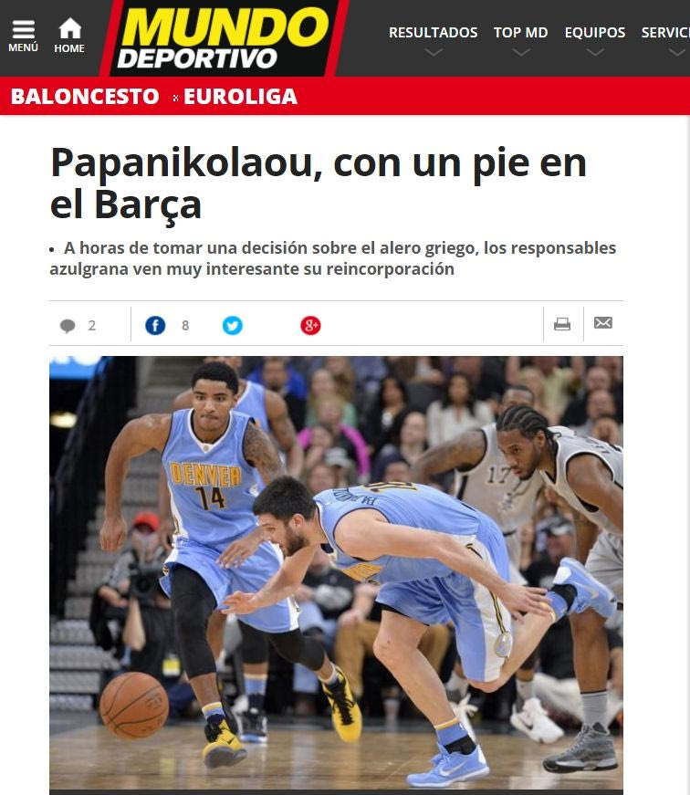 Σε άρθρο που δημοσιεύεται στην “Mundo Deportivo”, υπάρχει εκτενής ανάλυση της κατάστασης που επικρατεί από τότε που ο Παπανικολάου έμεινε ελεύθερος από το ΝΒΑ και γίνεται καταγραφή των δεδομένων αναφορικά με το ενδιαφέρον της Μπαρτσελόνα. Στο σχετικό κείμενο, το οποίο τιτλοφορείται “Ο Παπανικολάου με το ένα πόδι στην Μπάρτσα”, τονίζεται πως οι άνθρωποι της καταλανικής ομάδας βάζουν στη ζυγαριά τα υπέρ και τα κατά της επιστροφής του 25χρονου παίκτη στον σύλλογο, αλλά δίνεται ιδιαίτερη έμφαση στα θετικά του να φορέσει ο “Παπ” για δεύτερη φορά την φανέλα της Μπαρτσελόνα.