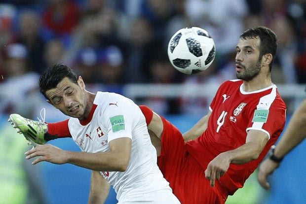 Serbia's Luka Milivojevic, right, and Switzerland's Blerim Dzemaili vie for the ball during the group E match between Switzerland and Serbia at the 2018 soccer World Cup in the Kaliningrad Stadium in Kaliningrad, Russia, Friday, June 22, 2018. (AP Photo/Victor Caivano) AP Photo/Victor Caivano