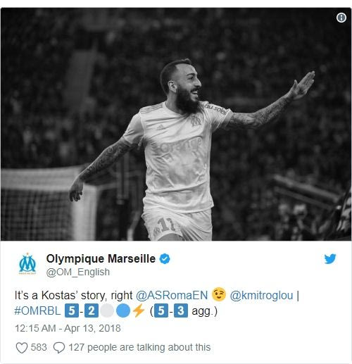 Ο Έλληνας διεθνής επιθετικός δεν κατάφερε να σκοράρει κάποιο γκολ, αλλά είχε σημαντική συμβολή στην επιτυχία της ομάδας του, και γι’ αυτόν τον λόγο μετά το τέλος του αγώνα, ο επίσημος λογαριασμός της Μαρσέιγ στο twitter ανέβασε μία φωτογραφία του και έκανε λόγο για “την ιστορία του Κώστα”, κάνοντας, μάλιστα, tag και τη Ρόμα.