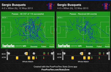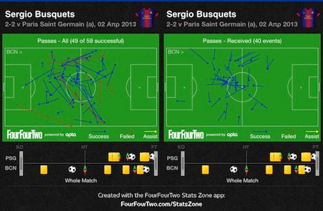 Τα γραφήματα δείχνουν τις πάσες του Μπούσκετς και τις φορές που υποδέχθηκε την μπάλα στο 4-0 επί της Μίλαν κι ακολούθως στα δύο παιχνίδια κόντρα στην Παρί. Το θέμα δεν είναι τόσο το ποσοστό ευστοχίας, που κόντρα στη Μίλαν ήταν στο 92% και κόντρα στην Παρί στο 83% και στο 87%, όσο το μέγεθος της συμμετοχής. Εκεί οι διαφορές είναι τεράστιες κι αγγίζουν πτώση μεγαλύτερης και του 50%, αφού πχ στο Παρίσι ο Μπούσκετς υποδέχθηκε την μπάλα μόλις 40 φορές, ενώ κόντρα στην Μίλαν την είχε πάρει 93.