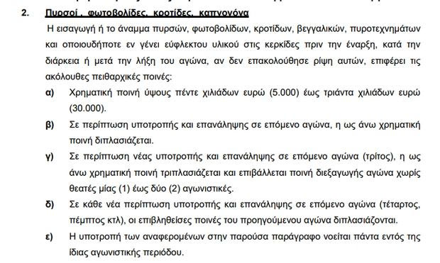 Σύμφωνα με το νέο, πιο αυστηρό, πειθαρχικό κώδικα ( Άρθρο 15, παράγραφος 2) η ομάδα της Θεσσαλονίκης θα πληρώσει μεταξύ 5.000€ και 30.000€ πρόστιμο, ενώ θα αρχίσει να ανησυχεί για ποινή της έδρας από την… τρίτη φορά!