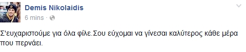 “Σε ευχαριστούμε για όλα φίλε. Σου εύχομαι να γίνεσαι καλύτερος κάθε μέρα που περνάει”, έγραψε χαρακτηριστικά στη σελίδα του στο facebook.