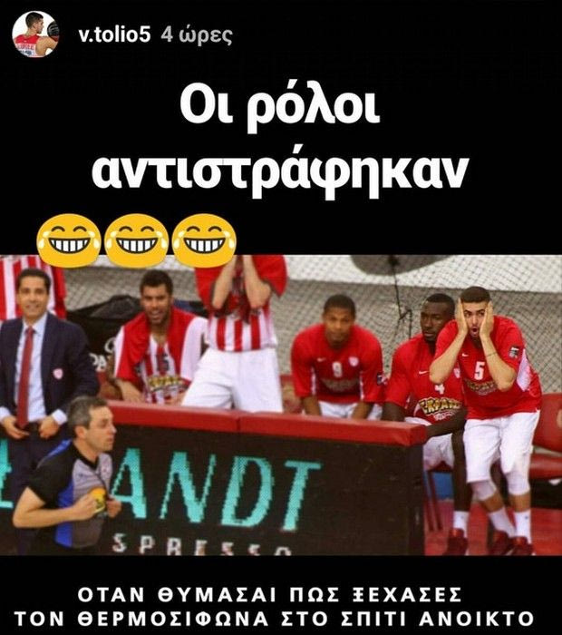 Χρησιμοποίησε ένα φωτογραφικό στιγμιότυπο από τον πρώτο τελικό με τον Παναθηναϊκό που τον δείχνει σε… απελπισία και το εμπλούτισε με την ατάκα ” όταν θυμάσαι πως ξέχασες το θερμοσίφωνα στο σπίτι ανοικτό” πλαισιώνοντάς το με τα emoticons του έντονου γέλιου…